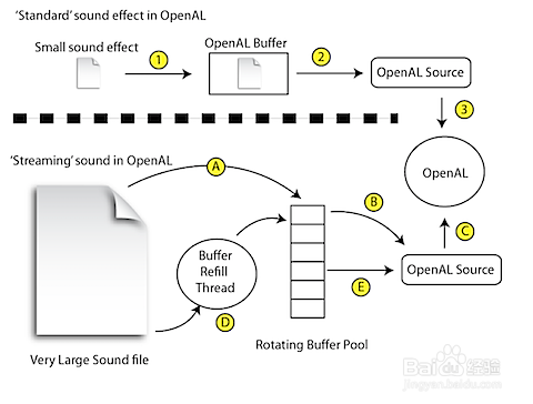 OpenAL主要由3個(gè)實(shí)體構(gòu)成:聽眾Listener, 聲源Source, 以及緩存Buffer。