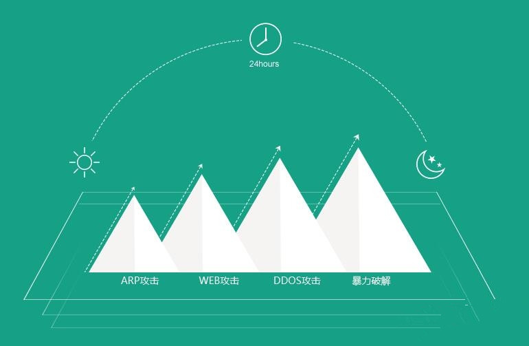 強(qiáng)有力的網(wǎng)絡(luò)防護(hù),實(shí)時(shí)監(jiān)測(cè)IP和端口訪問(wèn)的合法性,實(shí)時(shí)攔截ARP攻擊、Web攻擊(抗CC)、DDOS攻擊、暴力破譯。