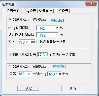 Mode2:把系統(tǒng)的默認(rèn)Ping模式設(shè)置為間隔Ping模式。在這種模式下,系統(tǒng)將定時地向目標(biāo)主機(jī)發(fā)送數(shù)據(jù)包,每隔 M1 分鐘 向目標(biāo)主機(jī)發(fā)送 M2 個 數(shù)據(jù)包。同時對這 M2 個數(shù)據(jù)包的返回信息進(jìn)行統(tǒng)計,統(tǒng)計出這 M2個 數(shù)據(jù)包返回信息的 最大響應(yīng)時間、最小響應(yīng)時間、平均響應(yīng)時間、發(fā)送數(shù)據(jù)包的個數(shù)、丟失數(shù)據(jù)包的個數(shù)、丟包率等等,并且將統(tǒng)計的結(jié)果進(jìn)行記錄。