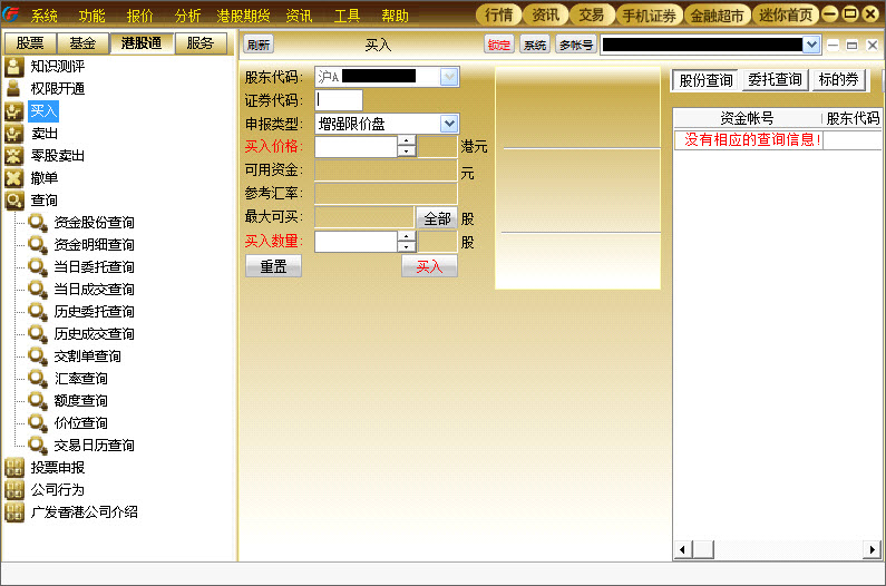 除了交易功能之外,也提供豐富的查詢功能,有資金股票查詢、資金明細(xì)查詢、當(dāng)日委托查詢、當(dāng)日成交查詢、歷史委托查詢、歷史成交查詢、交割單查詢、匯率查詢、額度查詢、價位查詢、交易日歷查詢等。