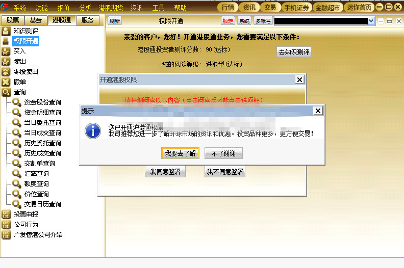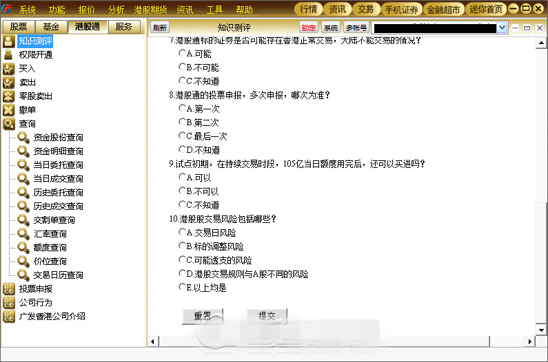 a-可點擊【權(quán)限開通】頁面的【去知識測評】按鈕到港股通知識測評頁面完成測評,并提交