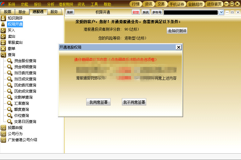五、點擊【點擊閱讀】,分別認(rèn)真閱讀彈出的客戶協(xié)議與風(fēng)險揭示書,同意后分別勾選“已閱讀并同意上述內(nèi)容”,點擊【我同意簽署】即可開通港股通權(quán)限