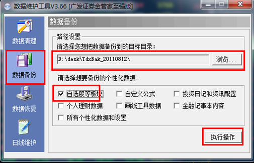2.在數(shù)據(jù)工具中,選中數(shù)據(jù)備份,設(shè)置好路徑,勾選自選股等板塊,然后執(zhí)行操作: