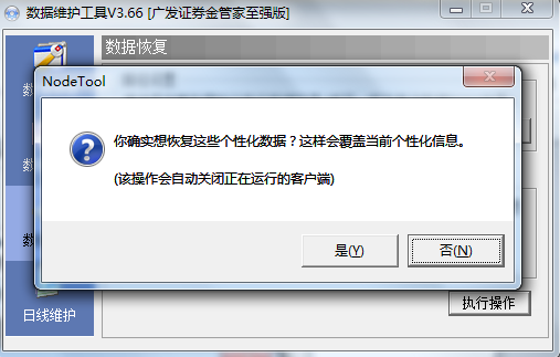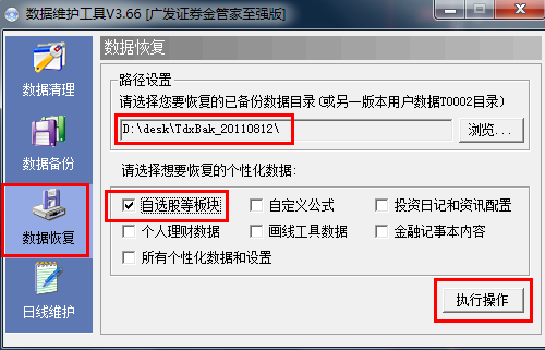 1.跟自選股備份一樣,先進(jìn)入數(shù)據(jù)維護(hù)工具,然后選中數(shù)據(jù)恢復(fù),選中以前備份了的數(shù)據(jù)的目錄,勾選自選股板塊,然后執(zhí)行操作。