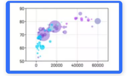 在此圖上,超過100個(gè)國(guó)家/地區(qū)顯示為單個(gè)圓圈。每個(gè)圓圈的X坐標(biāo)代表該國(guó)的GDP(PPP),而Y坐標(biāo)代表出生時(shí)的平均預(yù)期壽命。每個(gè)符號(hào)的大小與其所代表的國(guó)家的人口成比例(兩個(gè)最大的符號(hào)分別代表中國(guó)和印度)。最后,每個(gè)符號(hào)的顏色代表該國(guó)家所在的大陸。在這種情況下,此最終變量(顏色)是分類變量,但氣泡圖中的顏色也可以由連續(xù)變量定義:在該圖中,符號(hào)的X坐標(biāo),Y坐標(biāo)和大小與以前相同。但是,現(xiàn)在該符號(hào)的顏色連續(xù)不斷地代表該國(guó)家每1000個(gè)人的出生率。棱鏡現(xiàn)在還具有內(nèi)置的半透明配色方案,以便可以更清晰地看到重疊的符號(hào)。