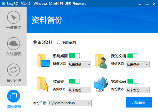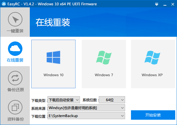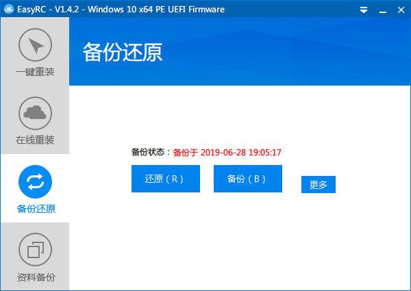 EasyRC是FirPE作者推出的一款一鍵重裝系統(tǒng)軟件,主要功能就是系統(tǒng)重裝(支持本地鏡像)系統(tǒng)備份、還原,還有就是在線重裝,系統(tǒng)采用windsys的系統(tǒng),比較純凈!當(dāng)然了,使用這款重裝系統(tǒng)軟件安裝的系統(tǒng),比較純凈,沒有什么惡意捆綁~軟件做的也非常棒,有需要的可以試試。