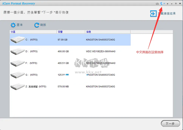 2、iCare Format Recovery的最好的事情之一就是它非常易于使用,盡管數(shù)據(jù)恢復(fù)工具通常不適合初學(xué)者,但這是一個(gè)不錯(cuò)的選擇。該界面非常簡(jiǎn)單,并提示用戶(hù)選擇要掃描的驅(qū)動(dòng)器,恢復(fù)屏幕還提供了一種快速的方式來(lái)選擇要處理的文件。