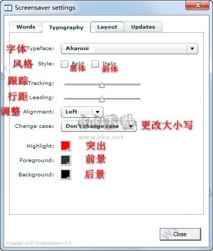 4、在字體和樣式設置中一共有直線、旋轉、隨機三種樣式,點擊“Chinese”即可將屏保設置成中文;