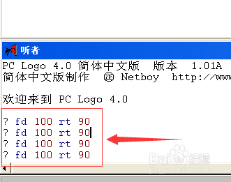 即【fd 100 rt 90】,這條命令表示前進(jìn)100個(gè)長(zhǎng)度單位,右轉(zhuǎn)90度。