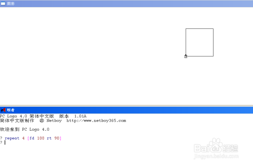 套用上面的格式內(nèi)容,正方形的一筆畫出命令為repeat 4 [fd 100 rt 90]