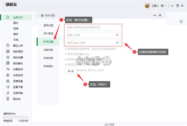 ① 點擊「賬戶設(shè)置」> ② 設(shè)置局域網(wǎng)賬戶密碼 > ③ 保存;