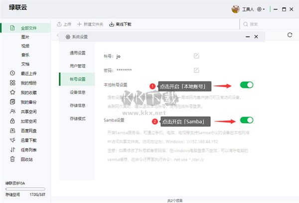 5、開啟「本地賬號」和「Samba」,按鈕綠色為開啟狀態(tài)。