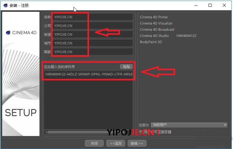 2.其余的跟著下一步即可,進入到安裝注冊界面,輸入名稱“YPOJIE.COM”公司“YPOJIE.COM”街道“YPOJIE.COM”城市“YPOJIE.COM”國家“YPOJIE.COM”特別注意要輸入注冊最重要的正版序列號,如下圖: