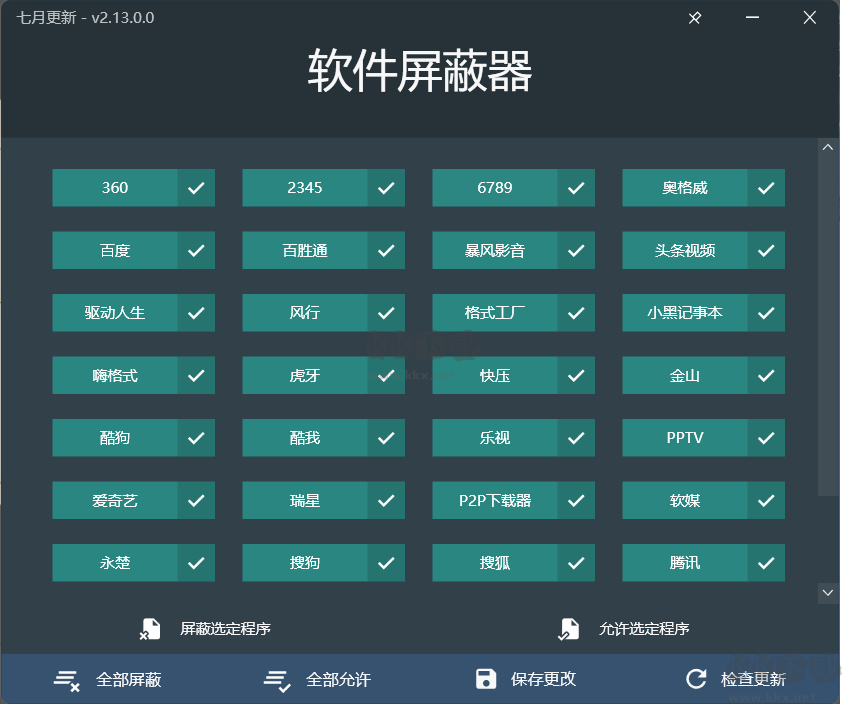 4、支持對(duì)軟件列表上的全部軟件屏蔽,也可以使用鼠標(biāo)點(diǎn)擊某款自己需要使用的軟件放行