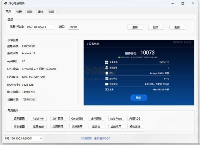 4. 打開電視助手,依次輸入設(shè)備IP,adb端口號(hào),點(diǎn)擊"連接"按鈕,連上設(shè)備;
