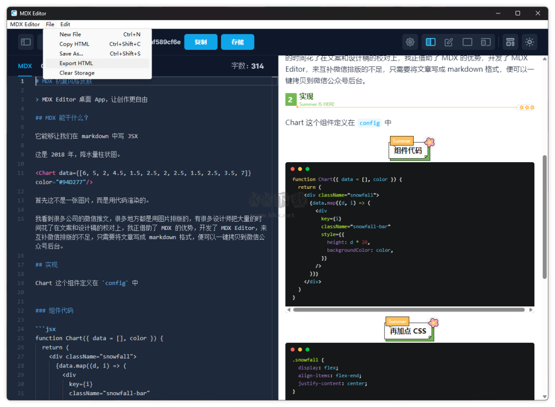 支持自定義樣式組件,自定義樣式,生成二維碼、代碼 diff 高亮;