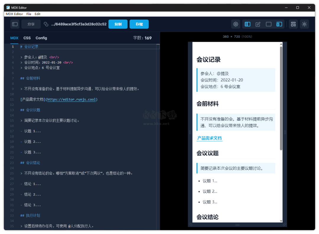 其它功能方面,支持把編輯好的內(nèi)容通過生成網(wǎng)址方式分享、支持保存為 md 和 mdx 格式。