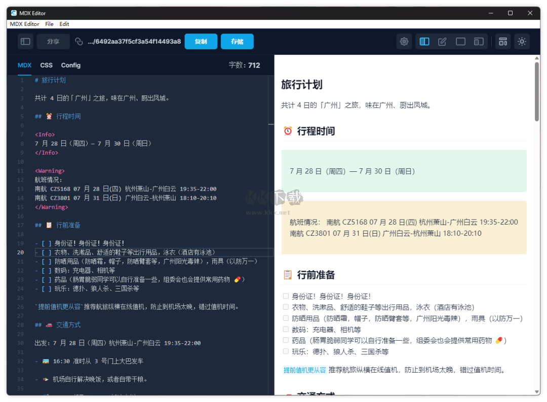 例如這個(gè)旅行計(jì)劃的模板,基本包含了所有旅行相關(guān)的內(nèi)容模板,你可以用過用 Markdown 來編輯,右邊預(yù)覽內(nèi)容。