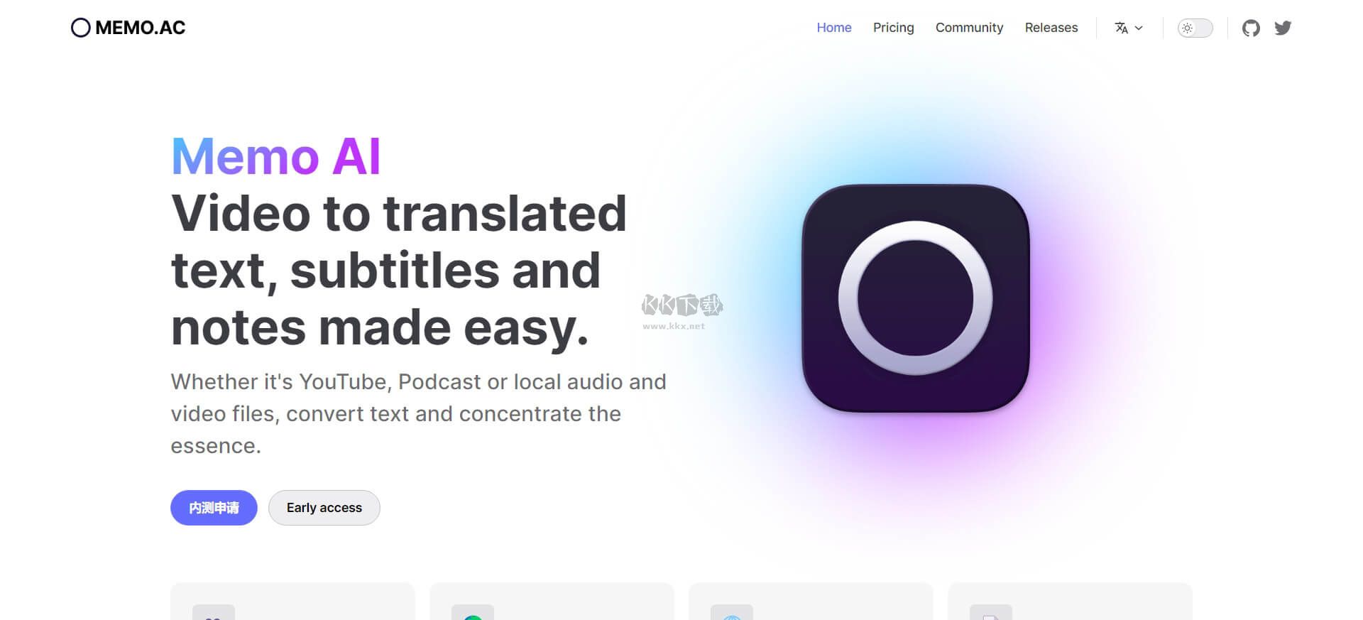 Memo AI視頻字幕工具是一款小型好用的AI音視頻轉(zhuǎn)譯工具,支持用戶(hù)們?cè)诰€(xiàn)利用AI技術(shù)來(lái)進(jìn)行YouTube等視頻的轉(zhuǎn)文字,支持多種語(yǔ)種之間的翻譯使用,你可以在這里高效的進(jìn)行AI音視頻轉(zhuǎn)譯個(gè)工具適用于多種場(chǎng)景讓用戶(hù)們可以在這里便捷的提供視頻字幕,還能對(duì)字幕進(jìn)行調(diào)節(jié)使用,輕松的進(jìn)行編輯,感興趣的用戶(hù)快來(lái)KK下載體驗(yàn)吧~