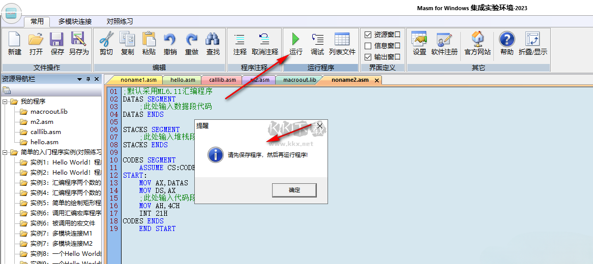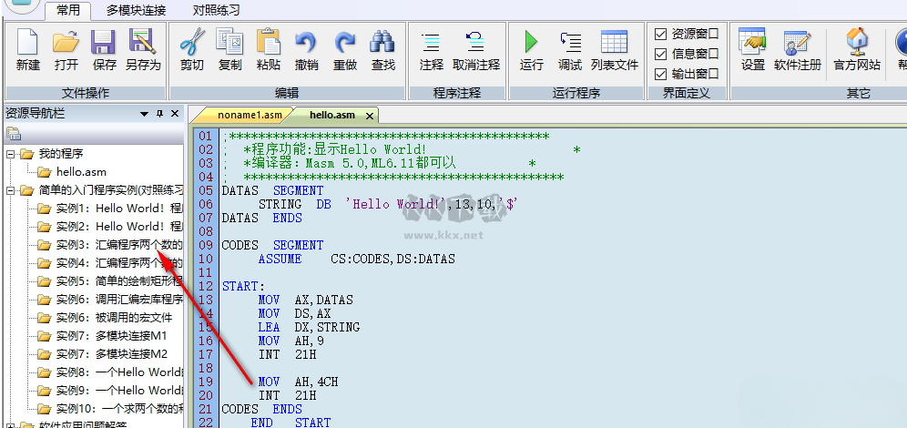 2..方便練習(xí)資源導(dǎo)航欄中的“簡(jiǎn)單的入門程序?qū)嵗?rdquo;、“DOS匯編實(shí)例源程序”、“WINDOWS匯編實(shí)例源程序”中的程序,如圖所示,右鍵打開(kāi)簡(jiǎn)單入門程序?qū)嵗械腍ello World程序?qū)φ站毩?xí)。