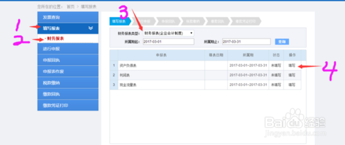 選擇填寫報(bào)表——財(cái)務(wù)報(bào)表,根據(jù)公司所用記賬方式選擇報(bào)表類型,進(jìn)行填寫資產(chǎn)負(fù)債表、利潤(rùn)表及其現(xiàn)金流量表。如下圖所示: