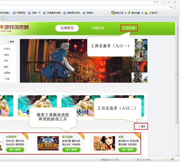 1、我們先松果游戲瀏覽器,在默認(rèn)頁的“推薦工具”模塊找到所需的游戲工具。