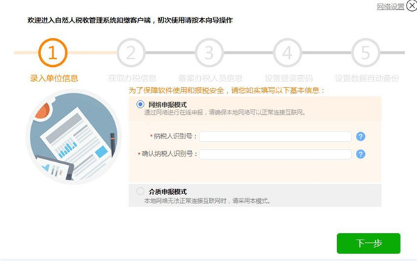 在[納稅人識(shí)別號(hào)]/[確認(rèn)納稅人識(shí)別號(hào)]的位置輸入單位稅號(hào),已經(jīng)進(jìn)行過(guò)三證合一的單位則輸入社會(huì)信用代碼,點(diǎn)擊【下一步】按鈕。