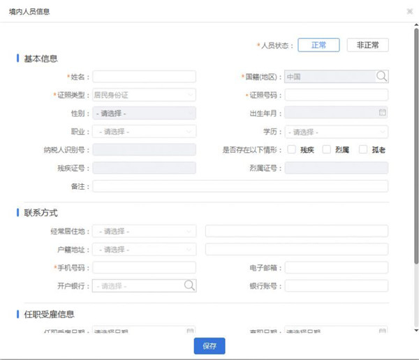 點(diǎn)擊【添加】按鈕,可以打開(kāi)人員的添加界面。把相應(yīng)信息錄入正確后,點(diǎn)擊【保存】按鈕即可添加成功。