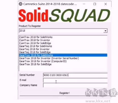 4、打開(kāi)_SolidSQUAD_ 文件夾下Camnetics.Suite.2018.LicGen.01072017.SSQ.exe 注冊(cè)機(jī),選擇GearTrax 2018 sodworks 并粘貼生成的序列號(hào)進(jìn)去,隨便輸入個(gè)Email和公司名,然后點(diǎn)擊下面的reqister