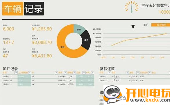 逛論壇時(shí)經(jīng)常能夠看到一些車(chē)主使用APP記錄自己愛(ài)車(chē)的相關(guān)信息,其實(shí)Excel也能做到。這套表格結(jié)構(gòu)清晰,配色大方,除了每次加油、還款、維護(hù)記錄外,還用圖表將費(fèi)用占比及費(fèi)用的變化曲線標(biāo)識(shí)了出來(lái),同時(shí)還有貸款余額、加油升數(shù)、平均MPG,如下圖所示: