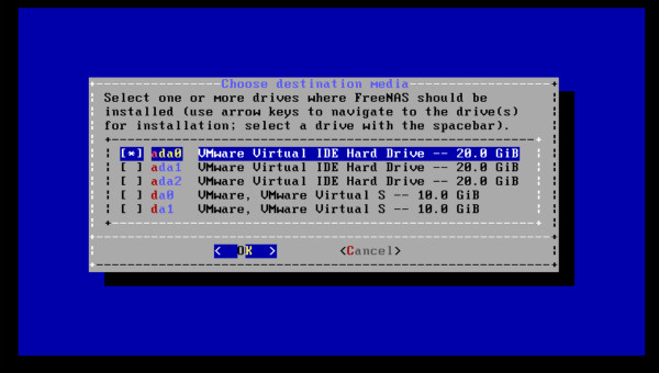 其中freenas將會(huì)安裝到一塊20G的硬盤中,freenas系統(tǒng)將會(huì)占用一整塊盤,這里多加了好幾塊硬盤不一定都用上,但是盡可能模擬真實(shí)環(huán)境吧。