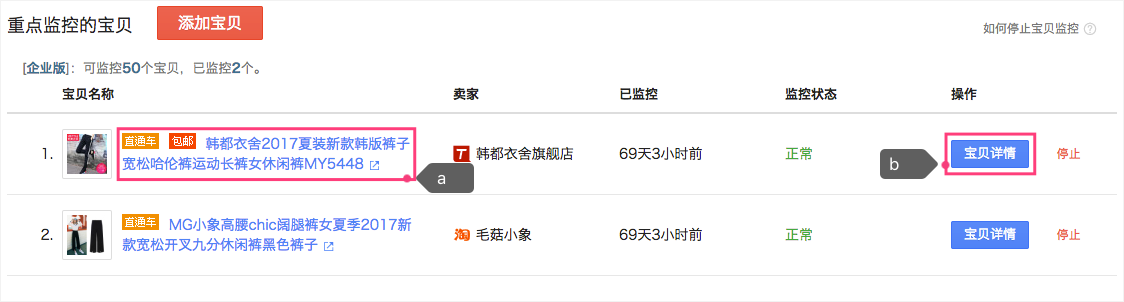 a.寶貝名稱,「直通車」圖標表示此寶貝正在用直通車推廣;「包郵」圖標表示此寶貝是包郵的