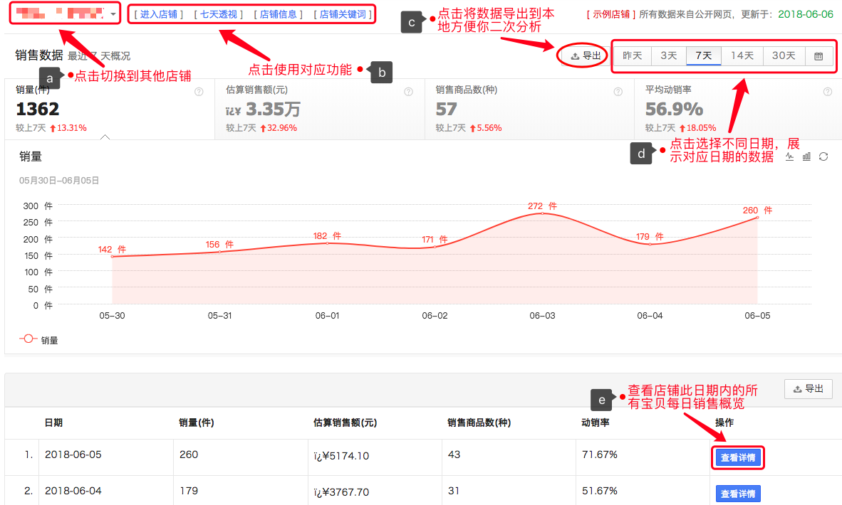 d.七天透視,此店鋪最近7天的數(shù)據(jù)概覽,通過此數(shù)據(jù),可快速了解此店鋪最近7天的各項數(shù)據(jù)波動,在該頁面,可繼續(xù)深入分析此店鋪其他詳細指標