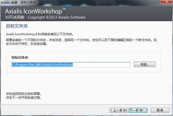 6、選擇軟件的安裝路徑,默認路徑為C:\Program Files (x86)\Axialis\IconWorkshop,可更改或直接點擊瀏覽更換路徑,完成點擊下一步