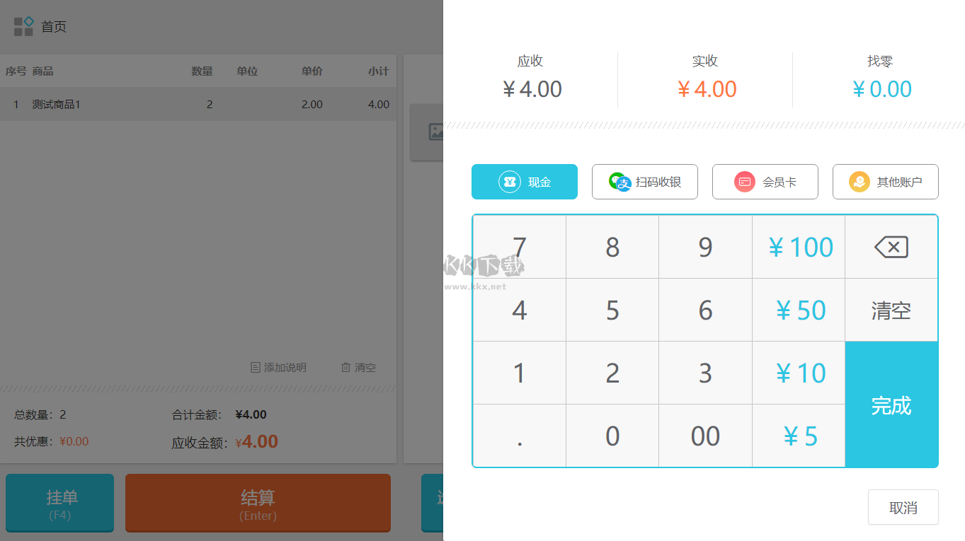 進入收銀臺界面,首先選擇商品(可通過掃碼槍掃碼添加,或在右側(cè)手選添加),選擇好之后,點擊“結(jié)算”,進入收銀界面。選擇收款方式,輸入收款金額,點擊完成即可。