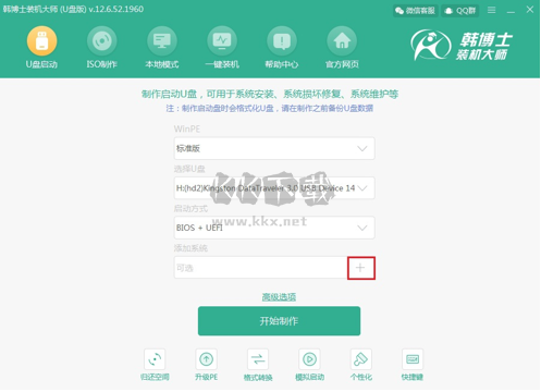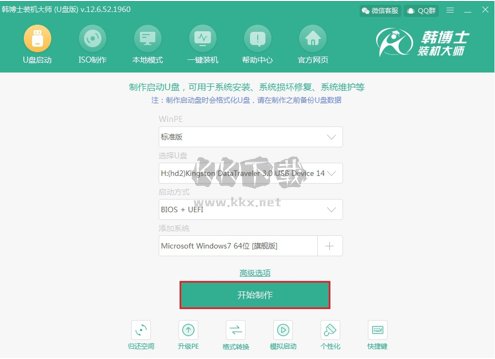 制作U盤啟動(dòng)盤。打開韓博士裝機(jī)大師,選擇“U盤啟動(dòng)”功能;在U盤模式下,選擇需要安裝的系統(tǒng),然后點(diǎn)擊“開始制作”。