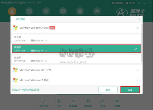 第三步:韓博士裝機(jī)大師為我們提供多個(gè)Windows系統(tǒng)文件,可使用軟件“推薦”的系統(tǒng),大家也可以根據(jù)自己的喜好進(jìn)行選擇,接著點(diǎn)擊右下角“選擇”按鈕,進(jìn)行下一步操作。此處小編以win7 64位旗艦版為例。