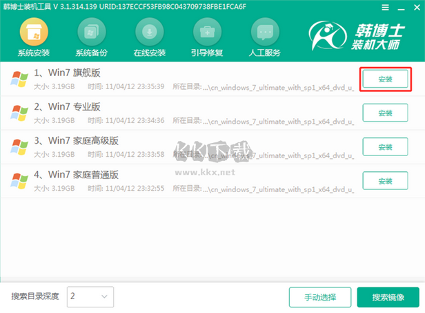 3.進(jìn)入PE界面后自動(dòng)彈出韓博士裝機(jī)工具,勾選U盤內(nèi)的“win7旗艦版”系統(tǒng),也可選擇自行下載的系統(tǒng)文件。點(diǎn)擊“安裝”;