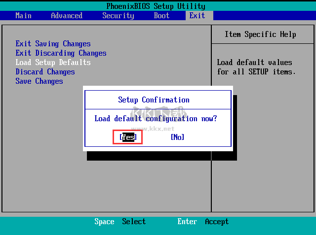第二步:選擇到“Load Setup Dwfaults”后,當跳出“Setup Confirmation”窗口后,按“←”“→”方向鍵選擇“yes”,再按“Enter”鍵確定。如圖所示: