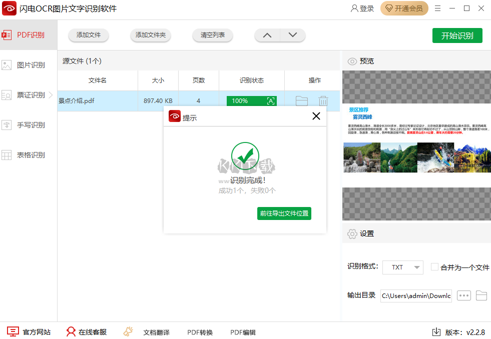 3、可以選擇識別格式任我們選擇,也可以選擇你想要的路徑,然后點擊“開始識別”。識別成功后,直接點擊“前往導(dǎo)出文件位置”可直接打開文件瀏覽。
