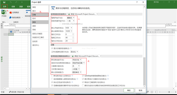 d.修改工期、工時(shí)的默認(rèn)單位,方便后面安排任務(wù)