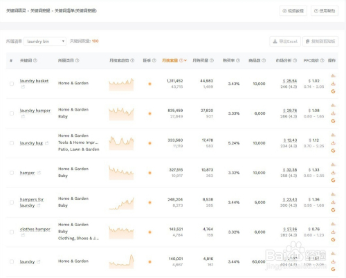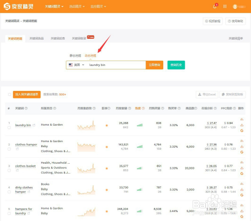 我們選取上述ASIN的核心關(guān)鍵詞之一:laundry bin 到關(guān)鍵詞挖掘頁面進行動態(tài)挖掘搜索。