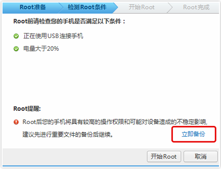 第三步:軟件會(huì)自動(dòng)檢測(cè)手機(jī)是否具備Root條件并貼心提醒備份重要文件。