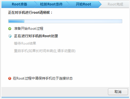 第四步:點(diǎn)擊開始Root,整個(gè)過程會(huì)重啟2次手機(jī)耗時(shí)約2-3分鐘。