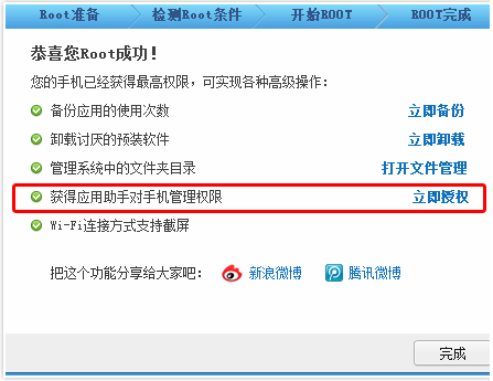 第五步:root完畢后,會(huì)提示恭喜您Root成功,立即授權(quán),即可獲得應(yīng)用助手對(duì)手機(jī)管理權(quán)限。