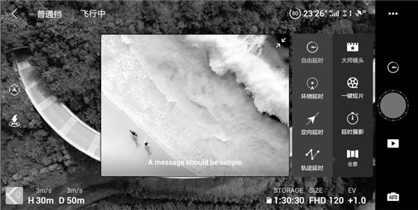 用戶通過(guò)設(shè)置參數(shù),無(wú)人機(jī)將在設(shè)定時(shí)間內(nèi)自動(dòng)拍攝一定數(shù)量的照片,并生成延時(shí)視頻。未起飛狀態(tài)下,可在地面進(jìn)行拍攝;起飛狀態(tài)下用戶可以通過(guò)打桿自由控制飛行器和云臺(tái)角度。