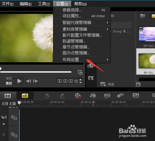 點(diǎn)擊設(shè)置菜單,我們可以管理素材,管理軌道,也可以對(duì)布局進(jìn)行設(shè)置,如圖所示: