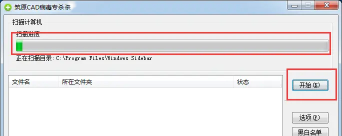 1、打開(kāi)筑原CAD病毒專殺條件,點(diǎn)擊開(kāi)始,等待進(jìn)度條走完