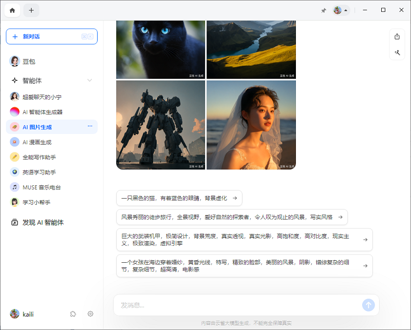 你還可以定制自己的AI智能體,選擇你喜歡的說話風格、技能和背景。豆包有各種各樣的AI智能體,能滿足你在學習、創(chuàng)作、職業(yè)、情感等方面的需求??靵硖剿靼?