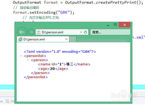 運(yùn)行程序,我們可以使用瀏覽器或文本編輯器打開XML文件,結(jié)果如下圖所示。如下圖所示,在person節(jié)點(diǎn)下面創(chuàng)建了name節(jié)點(diǎn)和age節(jié)點(diǎn),同時給name節(jié)點(diǎn)一個id屬性,值為1。